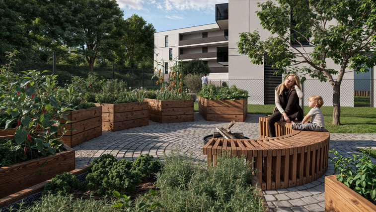 V rodinné zástavbě a zeleni je projekt klidným místem pro rodinu.