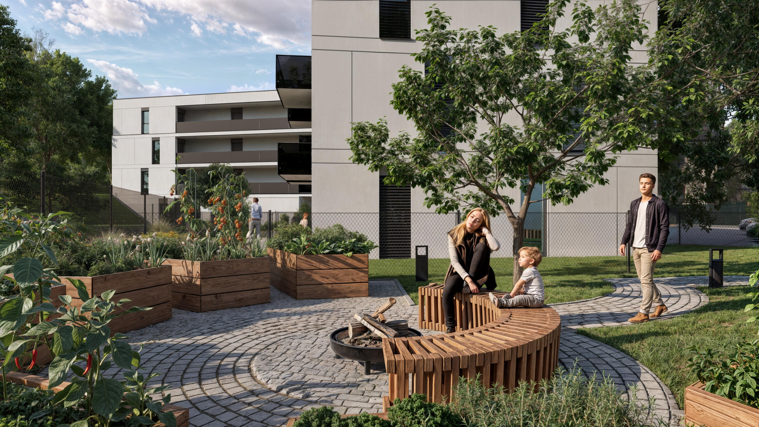V rodinné zástavbě a zeleni je projekt klidným místem pro rodinu.